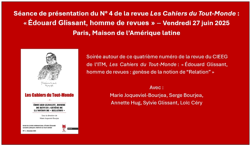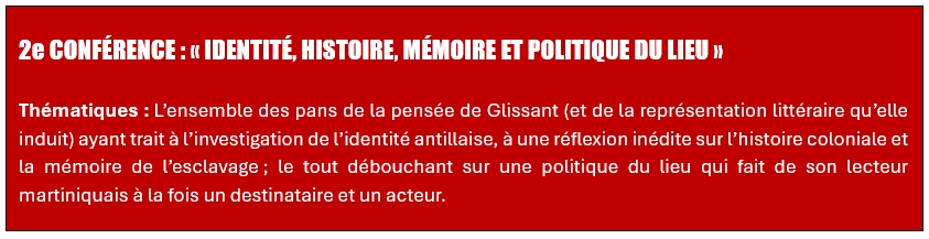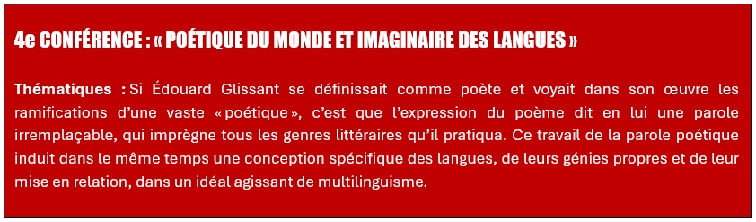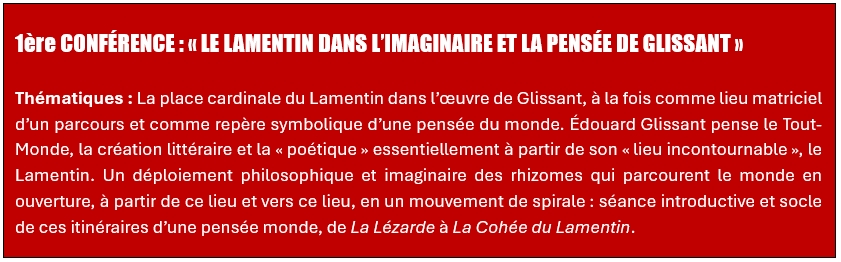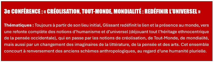 Ces interventions complémentaires seront focalisées sur certains aspects spécifiques de l’œuvre d’Édouard Glissant, et seront l’occasion d’offrir des perspectives nouvelles sur l’étude de sa pensée. Ces quatre interventions programmées en liens thématiques directs avec le cycle de conférences, permettront d’illustrer la richesse actuelle des études glissantiennes.