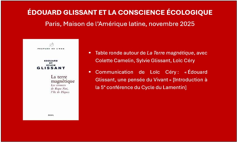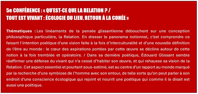 NB. Cette 5e conférence, qui regroupe deux thématiques (la Relation ; le discours concernant le Vivant) fera l’objet d’une introduction concernant la question du Vivant, lors d’une séance organisée en novembre à l’Institut du Tout-Monde (Paris, Maison de l’Amérique latine) – voir plus loin, programme des manifestations additionnelles.